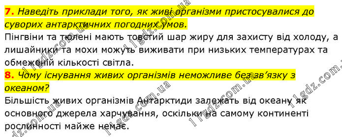 7. Наведіть приклади того, як живі організми пристосувалися до суворих антарктичних погодних умов. Пінгвіни та тюлені мають товстий шар жиру для захисту від холоду, а лишайники та мохи можуть виживати при низьких температурах та обмеженій кількості світла. 8. Чому існування живих організмів неможливе без зв’язку з океаном? Більшість живих організмів Антарктиди залежать від океану як основного джерела харчування, оскільки на самому континенті рослинності майже немає.