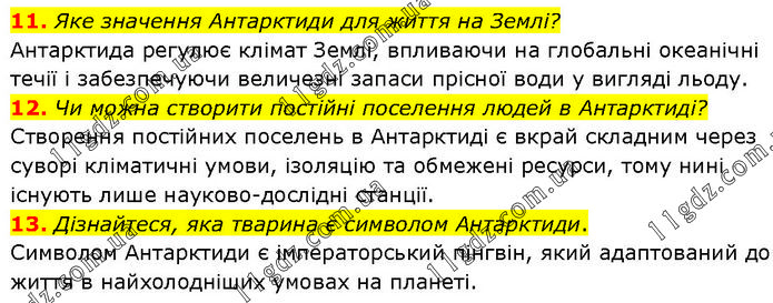 11. Яке значення Антарктиди для життя на Землі? Антарктида регулює клімат Землі, впливаючи на глобальні океанічні течії і забезпечуючи величезні запаси прісної води у вигляді льоду. 12. Чи можна створити постійні поселення людей в Антарктиді? Створення постійних поселень в Антарктиді є вкрай складним через суворі кліматичні умови, ізоляцію та обмежені ресурси, тому нині існують лише науково-дослідні станції. 13. Дізнайтеся, яка тварина є символом Антарктиди. Символом Антарктиди є імператорський пінгвін, який адаптований до життя в найхолодніших умовах на планеті.