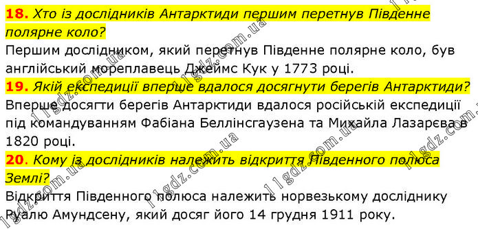 18. Хто із дослідників Антарктиди першим перетнув Південне полярне коло? Першим дослідником, який перетнув Південне полярне коло, був англійський мореплавець Джеймс Кук у 1773 році. 19. Якій експедиції вперше вдалося досягнути берегів Антарктиди? Вперше досягти берегів Антарктиди вдалося російській експедиції під командуванням Фабіана Беллінсгаузена та Михайла Лазарєва в 1820 році. 20. Кому із дослідників належить відкриття Південного полюса Землі? Відкриття Південного полюса належить норвезькому досліднику Руалю Амундсену, який досяг його 14 грудня 1911 року.