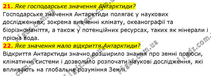21. Яке господарське значення Антарктиди? Господарське значення Антарктиди полягає у наукових дослідженнях, зокрема вивченні клімату, океанографії та біорізноманіття, а також у потенційних ресурсах, таких як мінерали і прісна вода. 22. Яке значення мало відкриття Антарктиди? Відкриття Антарктиди значно розширило знання про земні полюси, кліматичні системи і дозволило розпочати наукові дослідження, які впливають на глобальне розуміння Землі.