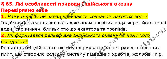 § 65. Які особливості природи Індійського океану Перевіряємо себе 1. Чому Індійський океан називають «океаном нагрітих вод»? Індійський океан називають «океаном нагрітих вод» через його теплі води, спричинені близькістю до екватора та тропіків. 2. Як формувався рельєф дна Індійського океану? У чому його складність? Рельєф дна Індійського океану формувався через рух літосферних плит, що створило складну систему підводних хребтів, жолобів і гір.