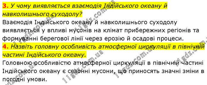 3. У чому виявляється взаємодія Індійського океану й навколишнього суходолу? Взаємодія Індійського океану й навколишнього суходолу виявляється у впливі мусонів на клімат прибережних регіонів та формуванні берегової лінії через ерозію й осадові процеси. 4. Назвіть головну особливість атмосферної циркуляції в північній частині Індійського океану. Головною особливістю атмосферної циркуляції в північній частині Індійського океану є сезонні мусони, що приносять значні зміни в погодні умови.