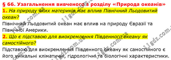 § 66. Узагальнення вивченого з розділу «Природа океанів» 1. На природу яких материків має вплив Північний Льодовитий океан? Північний Льодовитий океан має вплив на природу Євразії та Північної Америки. 2. Що є підставою для виокремлення Південного океану як самостійного? Підставою для виокремлення Південного океану як самостійного є його унікальні кліматичні, гідрологічні та біологічні характеристики.