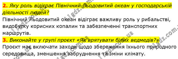 2. Яку роль відіграє Північний Льодовитий океан у господарській діяльності людей? Північний Льодовитий океан відіграє важливу роль у рибальстві, видобутку корисних копалин та забезпеченні транспортних маршрутів. 3. Виконайте у групі проєкт «Як врятувати білих ведмедів?» Проєкт має включати заходи щодо збереження їхнього природного середовища, зменшення забруднення та зміни клімату.
