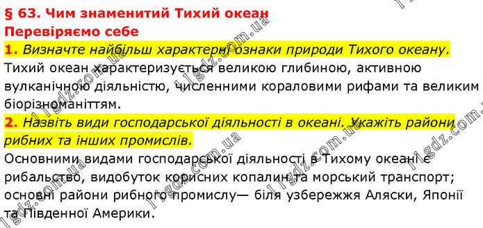 § 63. Чим знаменитий Тихий океан Перевіряємо себе 1. Визначте найбільш характерні ознаки природи Тихого океану. Тихий океан характеризується великою глибиною, активною вулканічною діяльністю, численними кораловими рифами та великим біорізноманіттям. 2. Назвіть види господарської діяльності в океані. Укажіть райони рибних та інших промислів. Основними видами господарської діяльності в Тихому океані є рибальство, видобуток корисних копалин та морський транспорт; основні райони рибного промислу— біля узбережжя Аляски, Японії та Південної Америки.