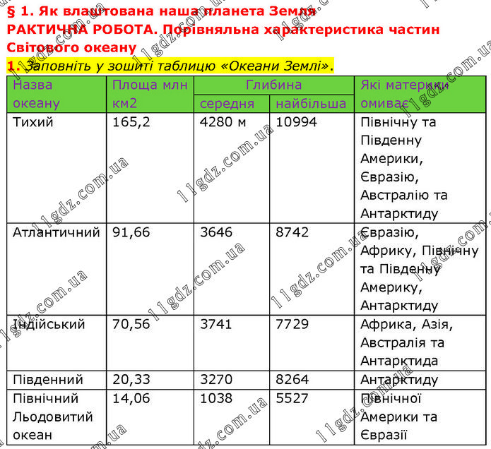 ПРАКТИЧНА РОБОТА. Порівняльна характеристика частин Світового океану 1. Заповніть у зошиті таблицю «Океани Землі». Назва океану Площа млн км2 Глибина Які материки омиває середня найбільша Тихий 165,2 4280 м 10994 Північну та Південну Америки, Євразію, Австралію та Антарктиду Атлантичний 91,66 3646 8742 Євразію, Африку, Північну та Південну Америку, Антарктиду Індійський 70,56 3741 7729 Африка, Азія, Австралія та Антарктида Південний 20,33 3270 8264 Антарктиду Північний Льодовитий океан 14,06 1038 5527 Північної Америки та Євразії
