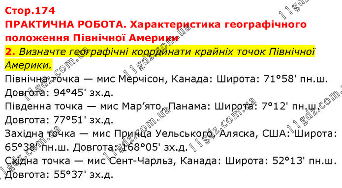 ПРАКТИЧНА РОБОТА. Характеристика географічного положення Північної Америки 2. Визначте географічні координати крайніх точок Північної Америки. Північна точка — мис Мерчісон, Канада: Широта: 71°58' пн.ш. Довгота: 94°45' зх.д. Південна точка — мис Мар’ято, Панама: Широта: 7°12' пн.ш. Довгота: 77°51' зх.д. Західна точка — мис Принца Уельського, Аляска, США: Широта: 65°38' пн.ш. Довгота: 168°05' зх.д. Східна точка — мис Сент-Чарльз, Канада: Широта: 52°13' пн.ш. Довгота: 55°37' зх.д.