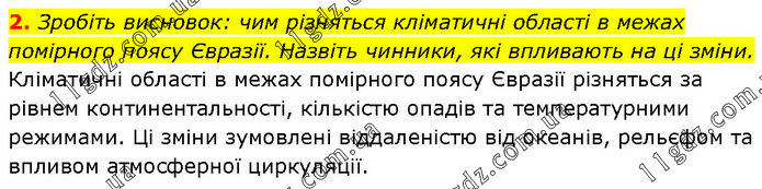 Зробіть висновок: чим різняться кліматичні області в межах помірного поясу Євразії. Назвіть чинники, які впливають на ці зміни. Кліматичні області в межах помірного поясу Євразії різняться за рівнем континентальності, кількістю опадів та температурними режимами. Ці зміни зумовлені віддаленістю від океанів, рельєфом та впливом атмосферної циркуляції.