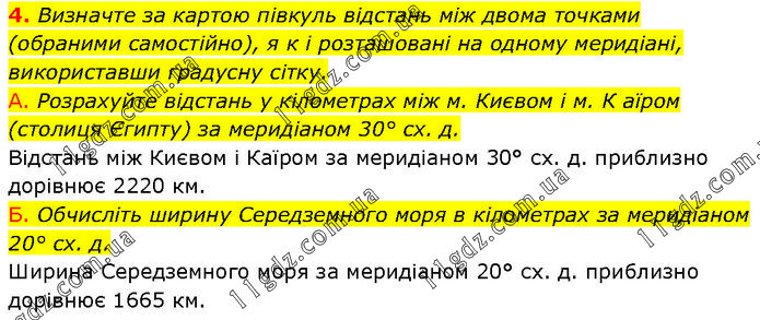 4. Визначте за картою півкуль відстань між двома точками (обраними самостійно), я к і розташовані на одному меридіані, використавши градусну сітку. А. Розрахуйте відстань у кілометрах між м. Києвом і м. К аїром (столиця Єгипту) за меридіаном 30° сх. д. Відстань між Києвом і Каїром за меридіаном 30° сх. д. приблизно дорівнює 2220 км. Б. Обчисліть ширину Середземного моря в кілометрах за меридіаном 20° сх. д. Ширина Середземного моря за меридіаном 20° сх. д. приблизно дорівнює 1665 км.