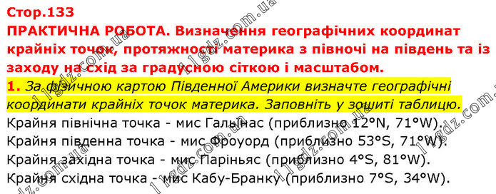 ПРАКТИЧНА РОБОТА. Визначення географічних координат крайніх точок, протяжності материка з півночі на південь та із заходу на схід за градусною сіткою і масштабом. 1. За фізичною картою Південної Америки визначте географічні координати крайніх точок материка. Заповніть у зошиті таблицю. Крайня північна точка - мис Гальїнас (приблизно 12°N, 71°W). Крайня південна точка - мис Фроуорд (приблизно 53°S, 71°W). Крайня західна точка - мис Паріньяс (приблизно 4°S, 81°W). Крайня східна точка - мис Кабу-Бранку (приблизно 7°S, 34°W).
