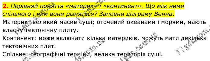 2. Порівняй поняття «материк» і «континент». Що між ними спільного і чим вони різняться? Заповни діаграму Венна. Материк: великий масив суші; оточений океанами і морями, мають власну тектонічну плиту. Континент: може включати кілька материків, можуть мати декілька тектонічних плит. Спільне: географічні терміни, велика територія суші.