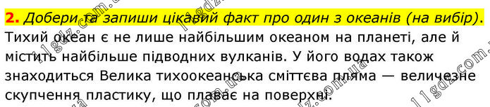 Добери та запиши цікавий факт про один з океанів (на вибір). Тихий океан є не лише найбільшим океаном на планеті, але й містить найбільше підводних вулканів. У його водах також знаходиться Велика тихоокеанська сміттєва пляма — величезне скупчення пластику, що плаває на поверхні.