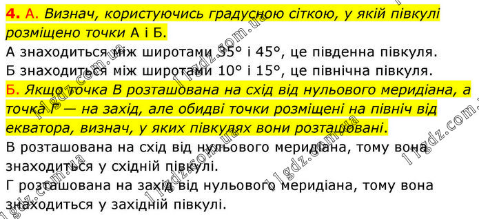 А. Визнач, користуючись градусною сіткою, у якій півкулі розміщено точки А і Б. А знаходиться між широтами 35° і 45°, це південна півкуля. Б знаходиться між широтами 10° і 15°, це північна півкуля. Б. Якщо точка В розташована на схід від нульового меридіана, а точка Г — на захід, але обидві точки розміщені на північ від екватора, визнач, у яких півкулях вони розташовані. В розташована на схід від нульового меридіана, тому вона знаходиться у східній півкулі. Г розташована на захід від нульового меридіана, тому вона знаходиться у західній півкулі.