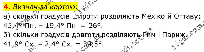 Визнач за картою: а) скільки градусів широти розділяють Мехіко й Оттаву; 45,4° Пн. – 19,4° Пн. = 26°. б) скільки градусів довготи розділяють Рим і Париж. 41,9° Сх. – 2,4° Сх. = 39,5°.