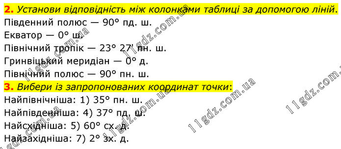 2. Установи відповідність між колонками таблиці за допомогою ліній. Південний полюс — 90° пд. ш. Екватор — 0° ш. Північний тропік — 23° 27' пн. ш. Гринвіцький меридіан — 0° д. Північний полюс — 90° пн. ш. 3. Вибери із запропонованих координат точки: Найпівнічніша: 1) 35° пн. ш. Найпівденніша: 4) 37° пд. ш. Найсхідніша: 5) 60° сх. д. Найзахідніша: 7) 2° зх. д.