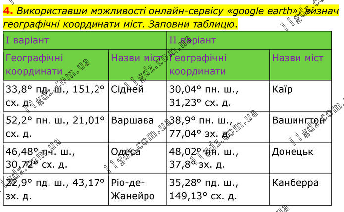 Використавши можливості онлайн-сервісу «google earth», визнач географічні координати міст. Заповни таблицю.