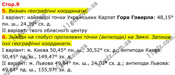 5. Визнач географічні координати. I варіант: найвищої точки Українських Карпат Гора Говерла: 48,15° пн. ш., 24,39° сх. д. II варіант: твого обласного центру 6. Знайди на глобусі протилежні точки (антиподи) на Землі. Запиши їхні географічні координати. I варіант: м. Києва 50,45° пн. ш., 30,52° сх. д.; антиподи Києва: 50,45° пд. ш., 149,47° зх. д. II варіант: м. Львова 49,84° пн. ш., 24,03° сх. д.; антиподи Львова: 49,84° пд. ш., 155,97° зх. д.