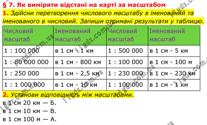 § 7. Як виміряти відстані на карті за масштабом 1. Здійсни перетворення числового масштабу в іменований та іменованого в числовий. Запиши отримані результати у таблицю. 2. Установи відповідність між масштабами. в 1 см 20 км — Б. в 1 см 10 км — В. в 1 см 100 м — А.
