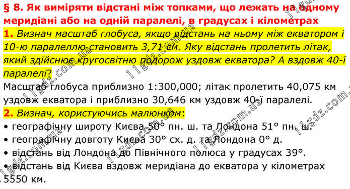 § 8. Як виміряти відстані між топками, що лежать на одному меридіані або на одній паралелі, в градусах і кілометрах 1. Визнач масштаб глобуса, якщо відстань на ньому між екватором і 10-ю паралеллю становить 3,71 см. Яку відстань пролетить літак, який здійснює кругосвітню подорож уздовж екватора? А вздовж 40-ї паралелі? Масштаб глобуса приблизно 1:300,000; літак пролетить 40,075 км уздовж екватора і приблизно 30,646 км уздовж 40-ї паралелі. 2. Визнач, користуючись малюнком: • географічну широту Києва 50° пн. ш. та Лондона 51° пн. ш. • географічну довготу Києва 30° сх. д. та Лондона 0° д. • відстань від Лондона до Північного полюса у градусах 39°. • відстань від Києва вздовж меридіана до екватора у кілометрах 5550 км.