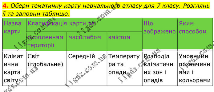 Обери тематичну карту навчального атласу для 7 класу. Розглянь її та заповни таблицю.