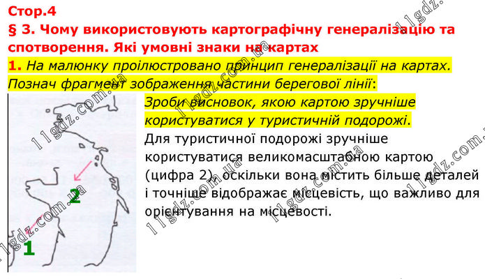 § 3. Чому використовують картографічну генералізацію та спотворення. Які умовні знаки на картах 1. На малюнку проілюстровано принцип генералізації на картах. Познач фрагмент зображення частини берегової лінії: Зроби висновок, якою картою зручніше користуватися у туристичній подорожі. Для туристичної подорожі зручніше користуватися великомасштабною картою (цифра 2), оскільки вона містить більше деталей і точніше відображає місцевість, що важливо для орієнтування на місцевості.