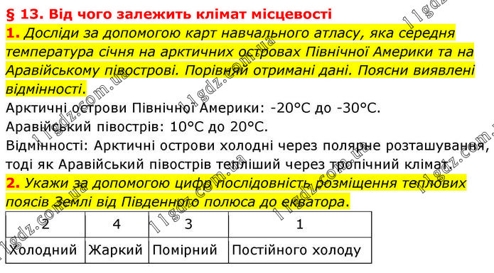 § 13. Від чого залежить клімат місцевості 1. Досліди за допомогою карт навчального атласу, яка середня температура січня на арктичних островах Північної Америки та на Аравійському півострові. Порівняй отримані дані. Поясни виявлені відмінності. Арктичні острови Північної Америки: -20°C до -30°C. Аравійський півострів: 10°C до 20°C. Відмінності: Арктичні острови холодні через полярне розташування, тоді як Аравійський півострів тепліший через тропічний клімат. 2. Укажи за допомогою цифр послідовність розміщення теплових поясів Землі від Південного полюса до екватора.