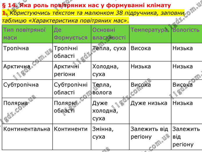 § 14. Яка роль повітряних нас у формуванні клімату 1. Користуючись текстом та малюнком 38 підручника, заповни таблицю «Характеристика повітряних мас».