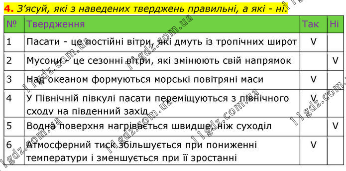 З’ясуй, які з наведених тверджень правильні, а які - ні. № Твердження Так Ні 1 Пасати - це постійні вітри, які дмуть із тропічних широт до екватора V 2 Мусони - це сезонні вітри, які змінюють свій напрямок двічі на добу V 3 Над океаном формуються морські повітряні маси V 4 У Північній півкулі пасати переміщуються з північного сходу на південний захід V 5 Водна поверхня нагрівається швидше, ніж суходіл V 6 Атмосферний тиск збільшується при пониженні температури і зменшується при її зростанні V
