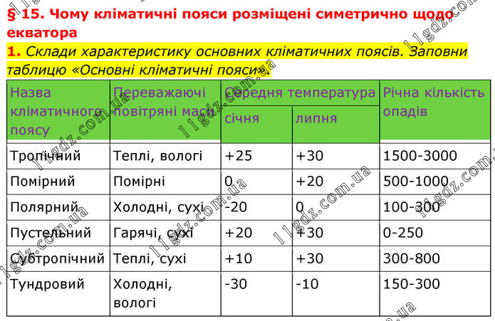 § 15. Чому кліматичні пояси розміщені симетрично щодо екватора 1. Склади характеристику основних кліматичних поясів. Заповни таблицю «Основні кліматичні пояси».
