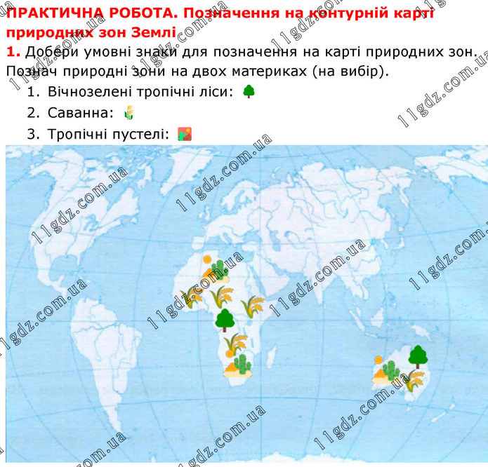 ПРАКТИЧНА РОБОТА. Позначення на контурній карті природних зон Землі 1. Добери умовні знаки для позначення на карті природних зон. Познач природні зони на двох материках (на вибір). 1. Вічнозелені тропічні ліси: 🌳 2. Саванна: 🌾 3. Тропічні пустелі: 🏜️