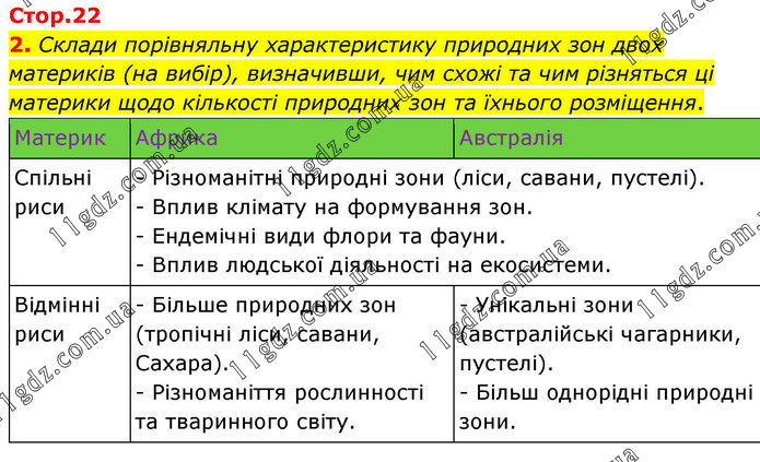 Склади порівняльну характеристику природних зон двох материків (на вибір), визначивши, чим схожі та чим різняться ці материки щодо кількості природних зон та їхнього розміщення.