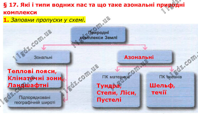 § 17. Які і типи водних пас та що таке азональні природні комплекси 1. Заповни пропуски у схемі.