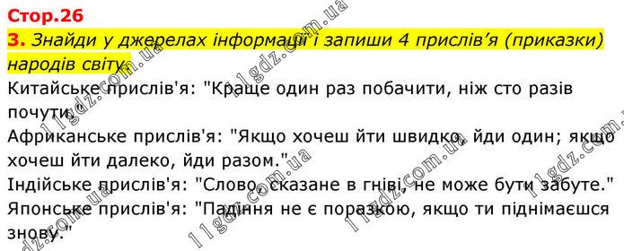 Знайди у джерелах інформації і запиши 4 прислів’я (приказки) народів світу. Китайське прислів'я: "Краще один раз побачити, ніж сто разів почути." Африканське прислів'я: "Якщо хочеш йти швидко, йди один; якщо хочеш йти далеко, йди разом." Індійське прислів'я: "Слово, сказане в гніві, не може бути забуте." Японське прислів'я: "Падіння не є поразкою, якщо ти піднімаєшся знову."