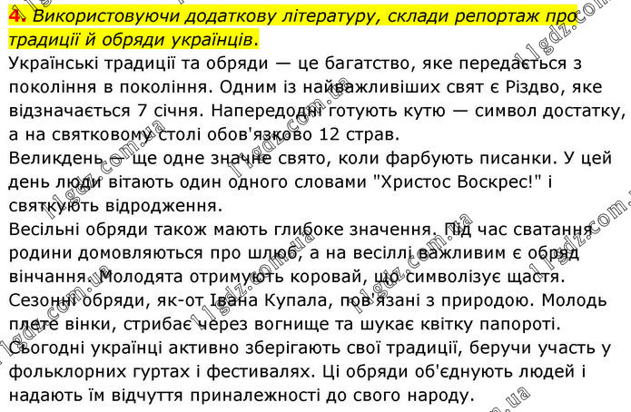 Використовуючи додаткову літературу, склади репортаж про традиції й обряди українців. Українські традиції та обряди — це багатство, яке передається з покоління в покоління. Одним із найважливіших свят є Різдво, яке відзначається 7 січня. Напередодні готують кутю — символ достатку, а на святковому столі обов'язково 12 страв. Великдень — ще одне значне свято, коли фарбують писанки. У цей день люди вітають один одного словами "Христос Воскрес!" і святкують відродження. Весільні обряди також мають глибоке значення. Під час сватання родини домовляються про шлюб, а на весіллі важливим є обряд вінчання. Молодята отримують коровай, що символізує щастя. Сезонні обряди, як-от Івана Купала, пов'язані з природою. Молодь плете вінки, стрибає через вогнище та шукає квітку папороті. Сьогодні українці активно зберігають свої традиції, беручи участь у фольклорних гуртах і фестивалях. Ці обряди об'єднують людей і надають їм відчуття приналежності до свого народу.