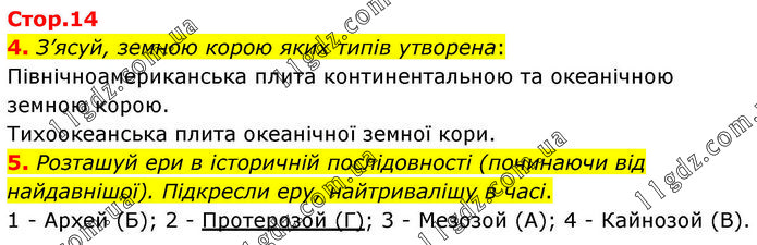 4. З’ясуй, земною корою яких типів утворена: Північноамериканська плита континентальною та океанічною земною корою. Тихоокеанська плита океанічної земної кори. 5. Розташуй ери в історичній послідовності (починаючи від найдавнішої). Підкресли еру, найтривалішу в часі. 1 - Архей (Б); 2 - Протерозой (Г); 3 - Мезозой (А); 4 - Кайнозой (В).
