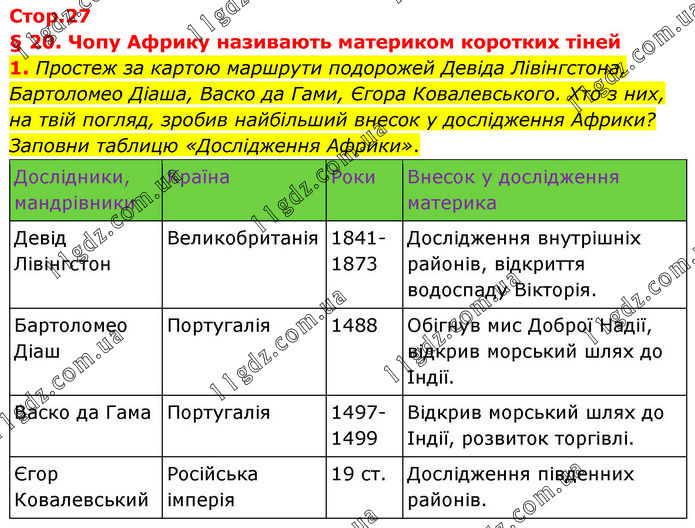 § 20. Чому Африку називають материком коротких тіней 1. Простеж за картою маршрути подорожей Девіда Лівінгстона, Бартоломео Діаша, Васко да Гами, Єгора Ковалевського. Хто з них, на твій погляд, зробив найбільший внесок у дослідження Африки? Заповни таблицю «Дослідження Африки».