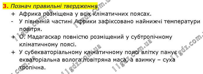 3. Познач правильні твердження + Африка розміщена у всіх кліматичних поясах. - У північній частині Африки зафіксовано найнижчі температури повітря. + О. Мадагаскар повністю розміщений у субтропічному кліматичному поясі. + У субекваторіальному кліматичному поясі влітку панує екваторіальна волога повітряна маса, а взимку – суха тропічна.