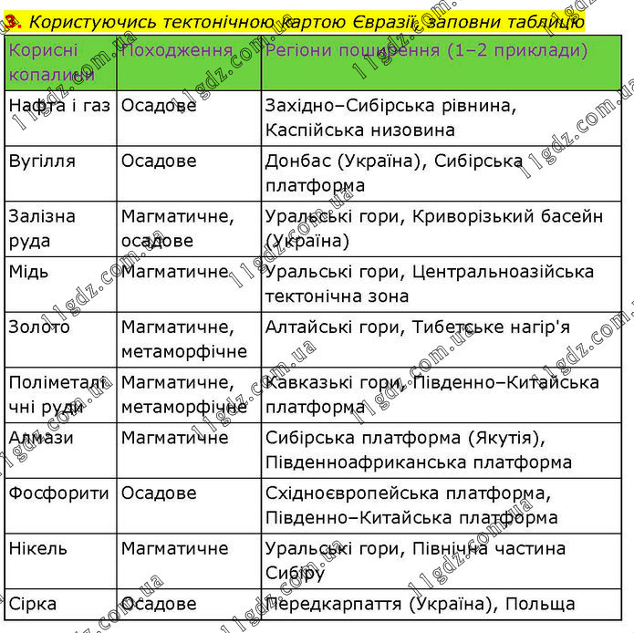 Користуючись тектонічною картою Євразії, заповни таблицю