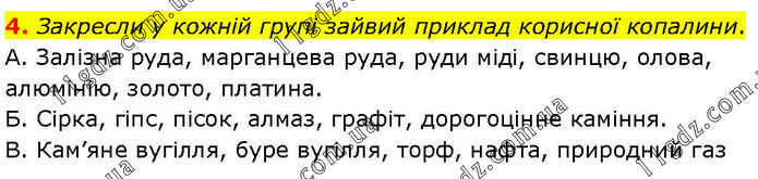Закресли у кожній групі зайвий приклад корисної копалини. А. Залізна руда, марганцева руда, руди міді, свинцю, олова, алюмінію, золото, платина. Б. Сірка, гіпс, пісок, алмаз, графіт, дорогоцінне каміння. В. Кам’яне вугілля, буре вугілля, торф, нафта, природний газ