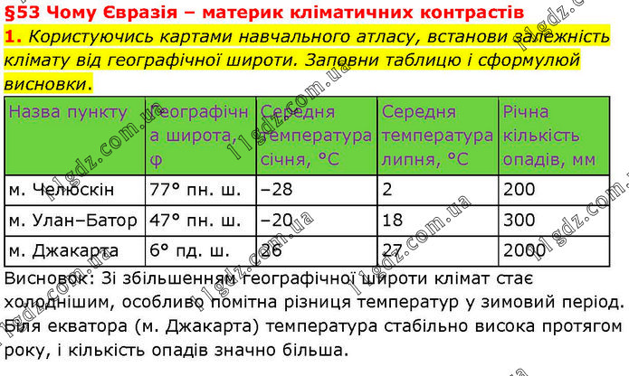 §53 Чому Євразія – материк кліматичних контрастів 1. Користуючись картами навчального атласу, встанови залежність клімату від географічної широти. Заповни таблицю і сформулюй висновки. Висновок: Зі збільшенням географічної широти клімат стає холоднішим, особливо помітна різниця температур у зимовий період. Біля екватора (м. Джакарта) температура стабільно висока протягом року, і кількість опадів значно більша.