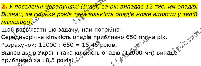 У поселенні Черапунджі (Індія) за рік випадає 12 тис. мм опадів. Визнач, за скільки років така кількість опадів може випасти у твоїй місцевості. Щоб розв'язати цю задачу, нам потрібно: Середньорічна кількість опадів приблизно 650 мм на рік. Розрахунок: 12000 : 650 = 18,46 років. Відповідь: в Україні така кількість опадів (12000 мм) випаде приблизно за 18,5 років.