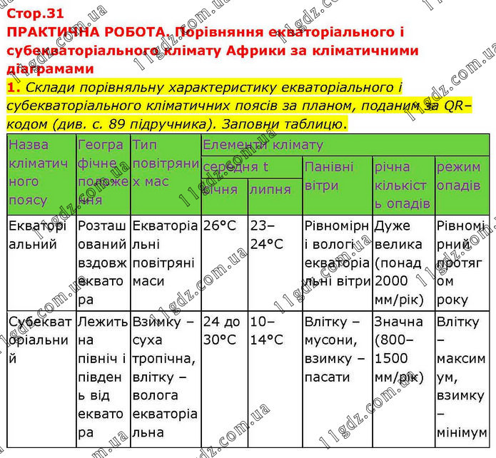 ПРАКТИЧНА РОБОТА. Порівняння екваторіального і субекваторіального клімату Африки за кліматичними діаграмами 1. Склади порівняльну характеристику екваторіального і субекваторіального кліматичних поясів за планом, поданим за QR–кодом (див. с. 89 підручника). Заповни таблицю.