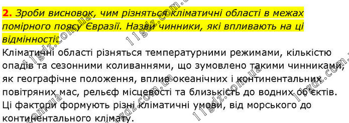 Зроби висновок, чим різняться кліматичні області в межах помірного поясу Євразії. Назви чинники, які впливають на ці відмінності. Кліматичні області різняться температурними режимами, кількістю опадів та сезонними коливаннями, що зумовлено такими чинниками, як географічне положення, вплив океанічних і континентальних повітряних мас, рельєф місцевості та близькість до водних об'єктів. Ці фактори формують різні кліматичні умови, від морського до континентального клімату.