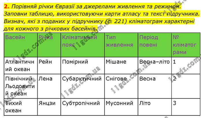 Порівняй річки Євразії за джерелами живлення та режимом. Заповни таблицю, використовуючи карти атласу та текст підручника. Визнач, які з поданих у підручнику (с. 221) кліматограм характерні для кожного з річкових басейнів.