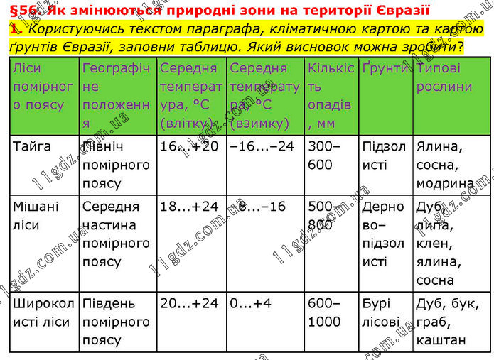 §56. Як змінюються природні зони на території Євразії 1. Користуючись текстом параграфа, кліматичною картою та картою ґрунтів Євразії, заповни таблицю. Який висновок можна зробити?