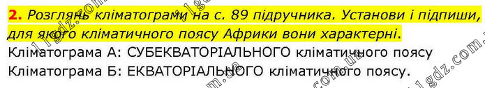 2. Розглянь кліматограми на с. 89 підручника. Установи і підпиши, для якого кліматичного поясу Африки вони характерні. Кліматограма А: СУБЕКВАТОРІАЛЬНОГО кліматичного поясу Кліматограма Б: ЕКВАТОРІАЛЬНОГО кліматичного поясу.
