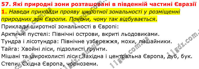 57. Які природні зони розташовані в південній частині Євразії 1. Наведи приклади прояву широтної зональності у розміщенні природних зон Європи. Поясни, чому так відбувається. Приклади широтної зональності в Європі: Арктичні пустелі: Північні острови, вкриті льодовиками. Тундра і лісотундра: Північне узбережжя, мохи, лишайники. Тайга: Хвойні ліси, підзолисті ґрунти. Мішані та широколисті ліси: Західна і центральна Європа, дуб, бук. Степи: Східна Європа, чорноземи.