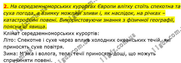2. На середземноморських курортах Європи влітку стоїть спекотна та суха погода, а взимку можливі зливи і, як наслідок, на річках – катастрофічні повені. Використовуючи знання з фізичної географії, поясни ці явища. Клімат середземноморських курортів: Літо: Спекотне і сухе через вплив холодних океанських течій, які приносять сухе повітря. Зима: М’яка і волога, теплі течії приносять дощі, що можуть спричиняти повені.