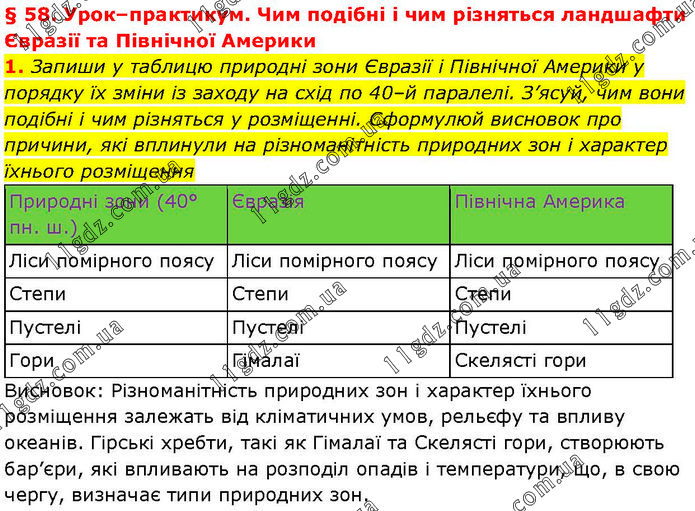 § 58. Урок–практикум. Чим подібні і чим різняться ландшафти Євразії та Північної Америки 1. Запиши у таблицю природні зони Євразії і Північної Америки у порядку їх зміни із заходу на схід по 40–й паралелі. З’ясуй, чим вони подібні і чим різняться у розміщенні. Сформулюй висновок про причини, які вплинули на різноманітність природних зон і характер їхнього розміщення Висновок: Різноманітність природних зон і характер їхнього розміщення залежать від кліматичних умов, рельєфу та впливу океанів. Гірські хребти, такі як Гімалаї та Скелясті гори, створюють бар’єри, які впливають на розподіл опадів і температури, що, в свою чергу, визначає типи природних зон.