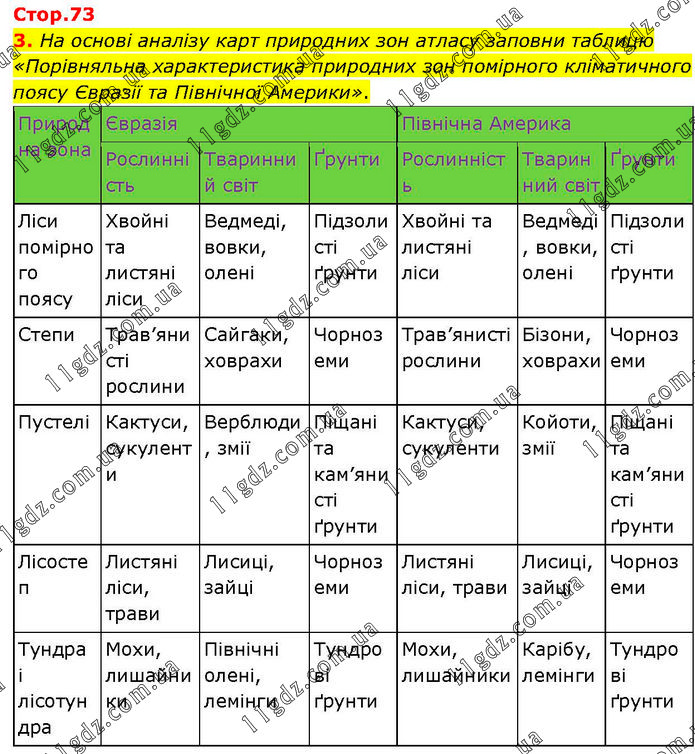 На основі аналізу карт природних зон атласу заповни таблицю «Порівняльна характеристика природних зон помірного кліматичного поясу Євразії та Північної Америки».